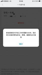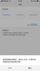 使用苹果设备登录后再点充值的时候,就会弹出【按照疫情防控要求,请进入北京一卡通升级页面完成升级后再充值!】。