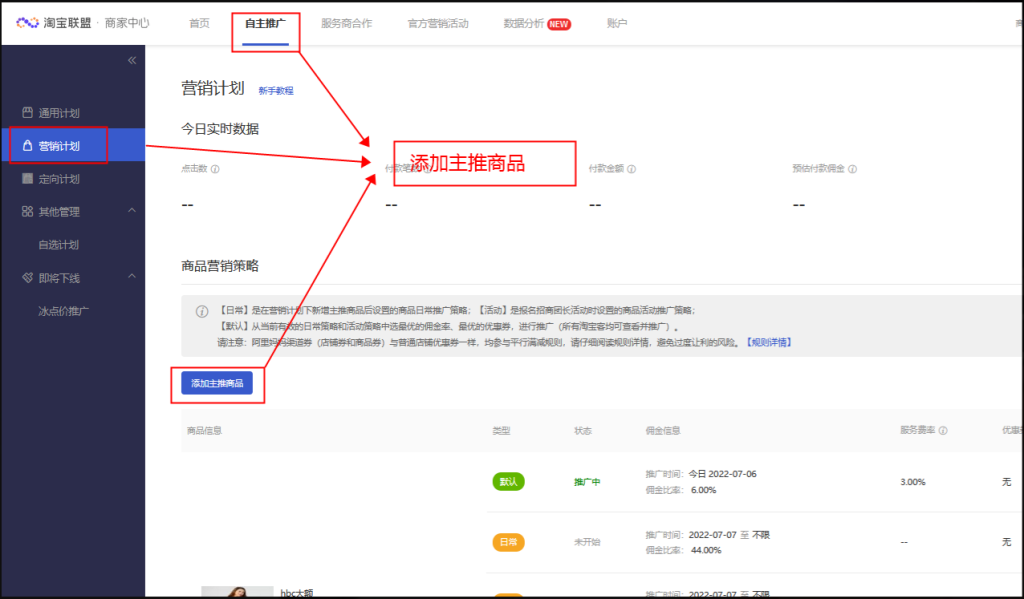 需要前往营销计划,针对需要加入内容商品库的商品设置佣金策略操作,详细操作参考下图: