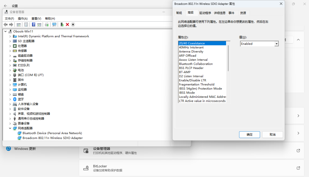 在博通网卡设备属性的高级里面会看到前两个20/40 coexistance 把后面的值设置为 enabled,同时紧挨着下面的40MHZ intolerant 的值也设置为 enabled。如下图所示: