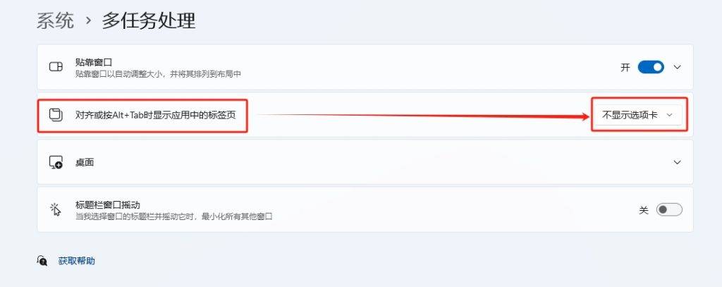 随后我们在 多任务处理的界面里 找到 对齐或按Alt+Tab时显示应用中的标签页 设置成不显示选项卡,如下图所示: