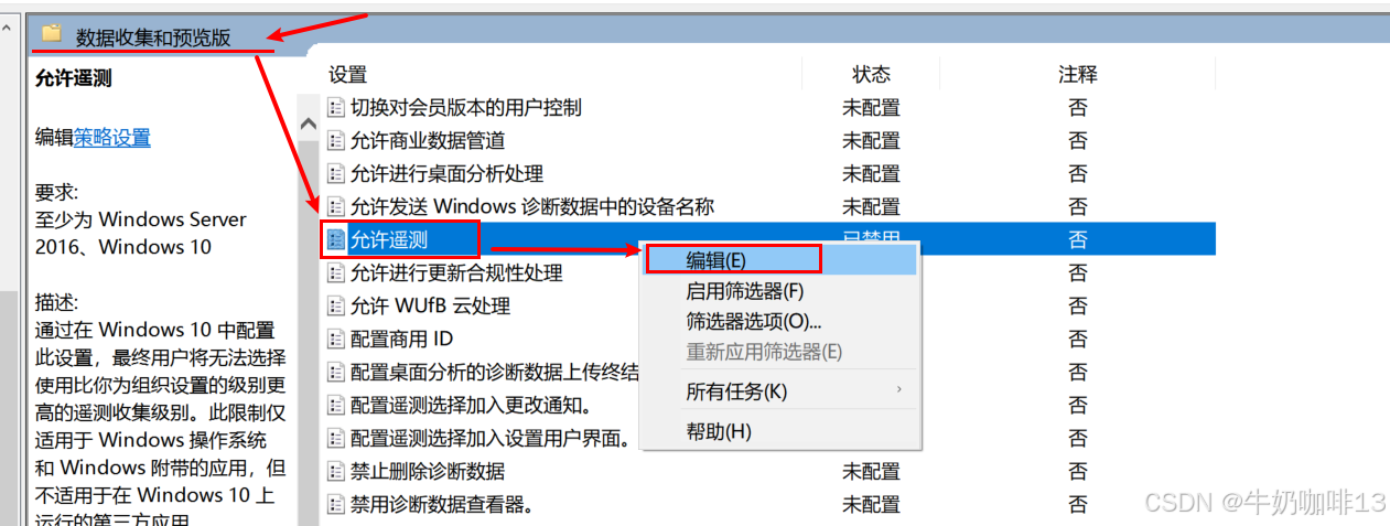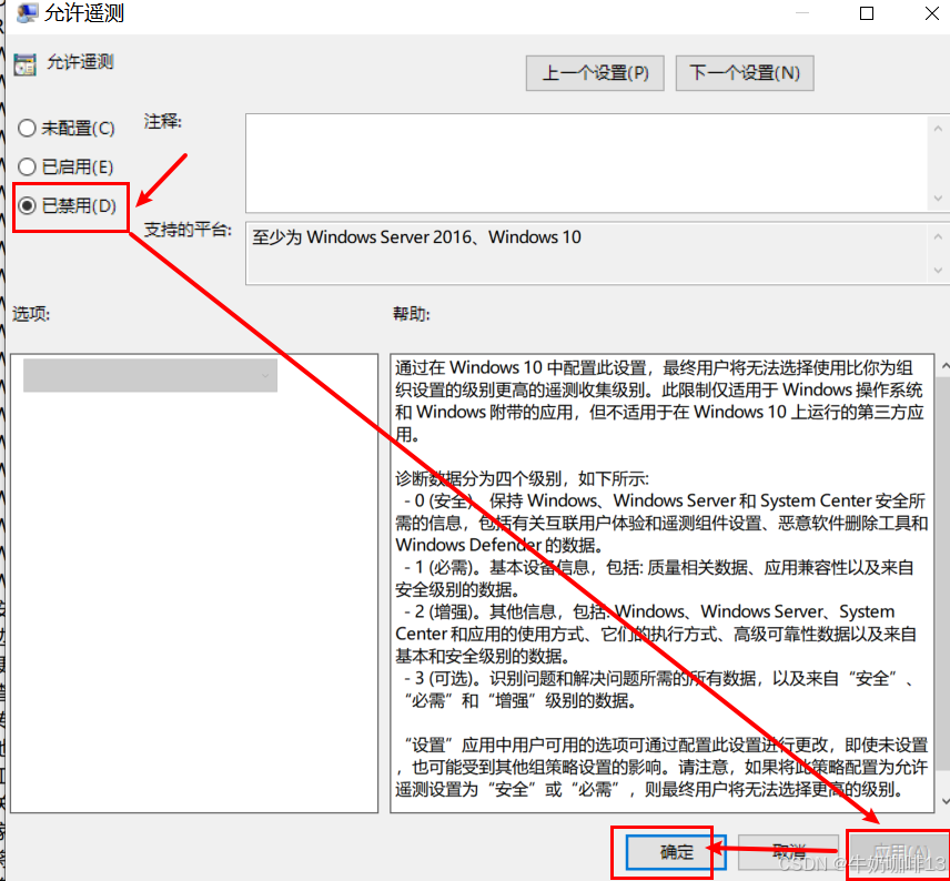 同时按下键盘的Windows+R键打开运行界面,然后在运行界面输入【gpedit.msc】打开本地策略编辑器,然后选择【 计算机设置 -> 管理模板 -> Windows组件 -> 数据收集和预览版 -> 选择右侧允许遥测设置为 已禁用】,如下图所示: