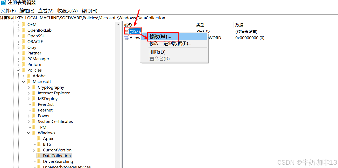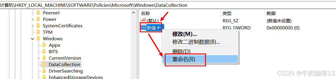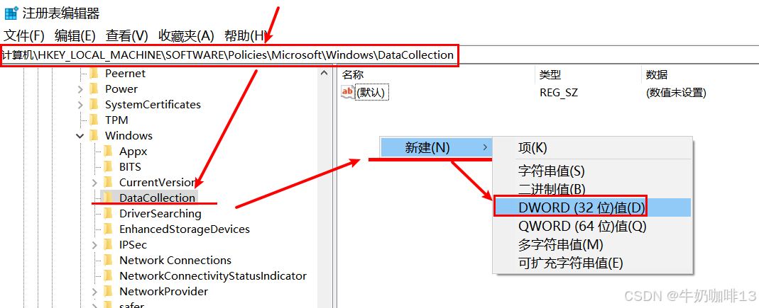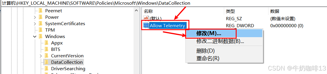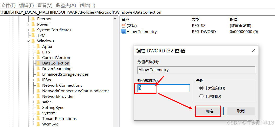 打开注册表,进入【计算机\HKEY_LOCAL_MACHINE\SOFTWARE\Policies\Microsoft\Windows\DataCollection】路径下,将默认内容设置为0;然后新增一个32位DWORD, 取名为【Allow Telemetry】, 设置值为 0;如下图所示:注意:在操作注册表前先导出注册表一份,用作备份;预防修改后出现问题恢复使用。