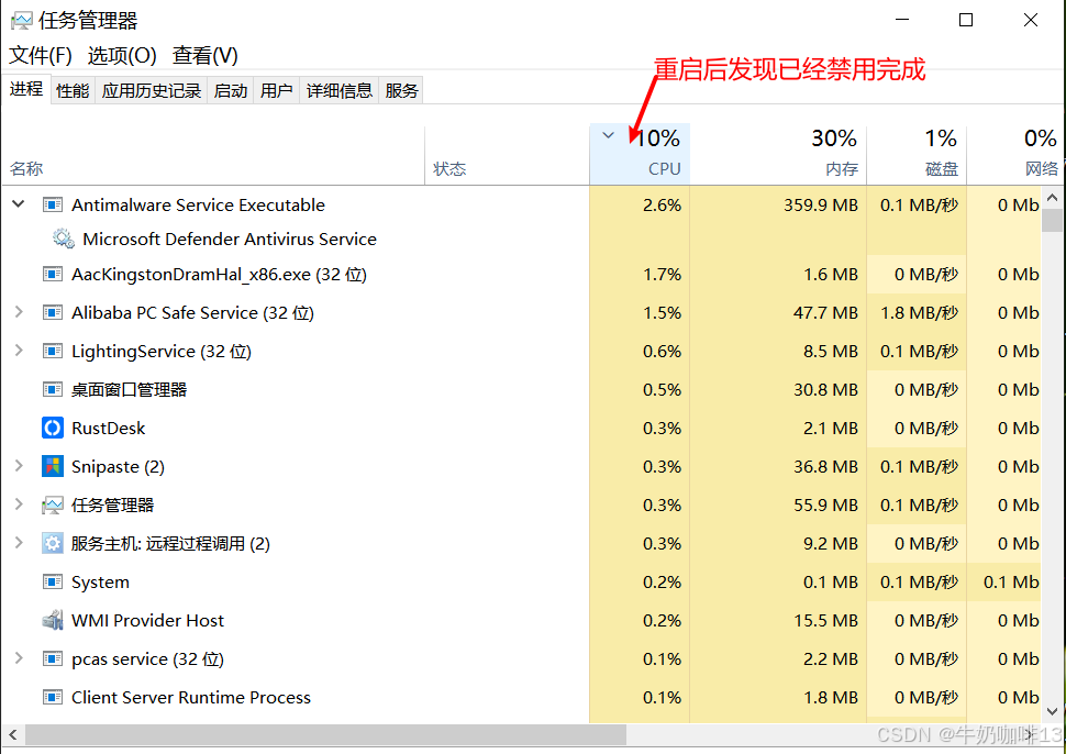 到这里表示使用3种禁用方式完成了,直接重启一下电脑;重启后再查看任务管理器,发现已经没有【CompatTelRunner】进程了,表示禁用成功,如下图所示: