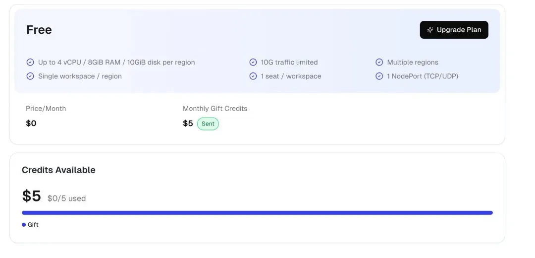 完成注册流程后,系统会自动激活每月 5 美元的免费资源配额,可立即用于部署所需的服务。