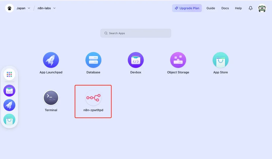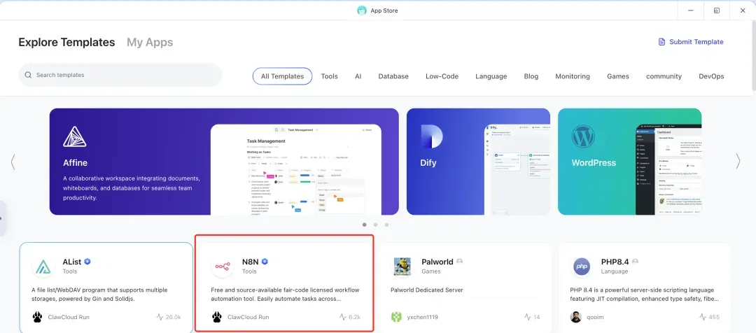 通过 ClawCloud 平台的应用商店(AppStore)功能,搜索并选择 n8n 工作流自动化工具进行一键部署。