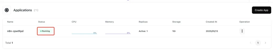 部署完成后,服务状态指示灯会从黄色(部署中)变为绿色,同时显示「Running」状态,表明 n8n 服务已成功启动并可以访问。